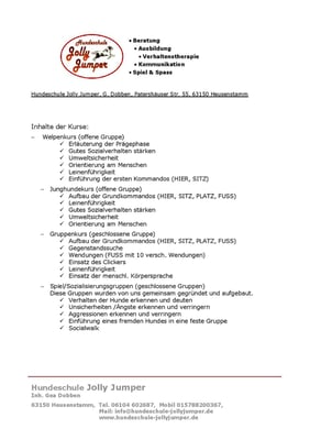 2 Jahre lang stand ich zu Beginn meiner Laufbahn als Hundetrainerin zusammen mit Gea Dobben von der Hundeschule Jolly Jumper auf dem Hundeplatz. So war es mir möglich, von Anfang an viel Praxiserfahrung sammeln zu können.