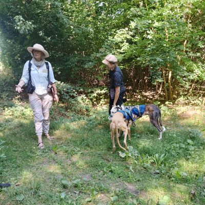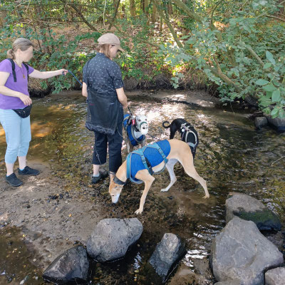 Die Route hatte Natascha perfekt geplant. Zu Beginn waren wir noch auf Wiesen unterwegs, und als es wärmer wurde ging es in den Wald. Zwischendurch konnten sich die Hunde im Bach abkühlen.